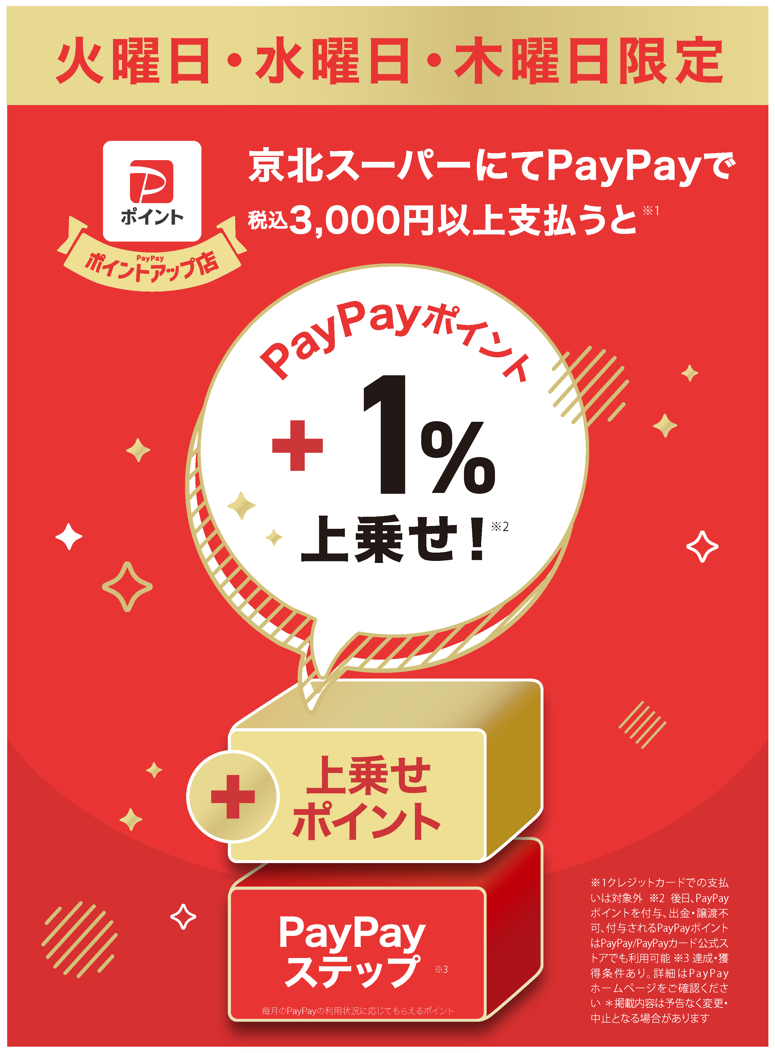 毎週火・水・木曜日にPayPayで税込3,000円以上お支払いいただくと、通常のPayPayポイントに加えて、上乗せで1%のPayPayポイントが付与されます!